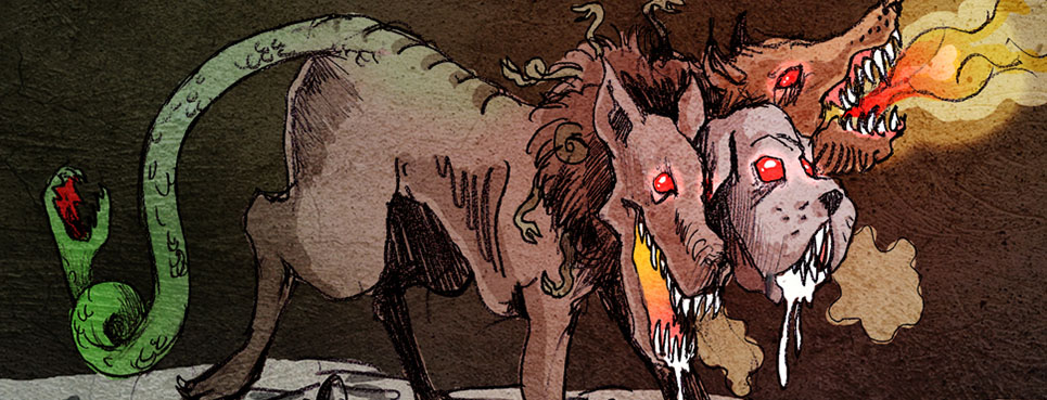 Cerberus, the three-headed guardian of the underworld from Greek myth, is a perfect example of a Multivillain; he’s literally three opponents sharing a single body! Using Mutants & Masterminds, 3rd Edition, you can build a textbook-legal three-headed servant of Hades as a single statblock to represent the body and central head. We’ll call the central statblock Ber (in mythology, the three heads don’t have separate names, so I’m choosing to label them Cer, Ber, and Us). Giving Ber 50 ranks in the Sidekick advantage grants him two 125-point lieutenants loyal to him. We can give Cer and Us very similar, slightly less powerful statblocks, but also the Interpose advantage, allowing them to take any nasty hits intended for Ber and meaning heroes must take out the two subordinate heads before they can begin the affect the “core” monster. Making Ber slightly more powerful means that although the fight gets easier as they take push the attack, last piece of the Multivillain left standing is still a respectable threat on its own.